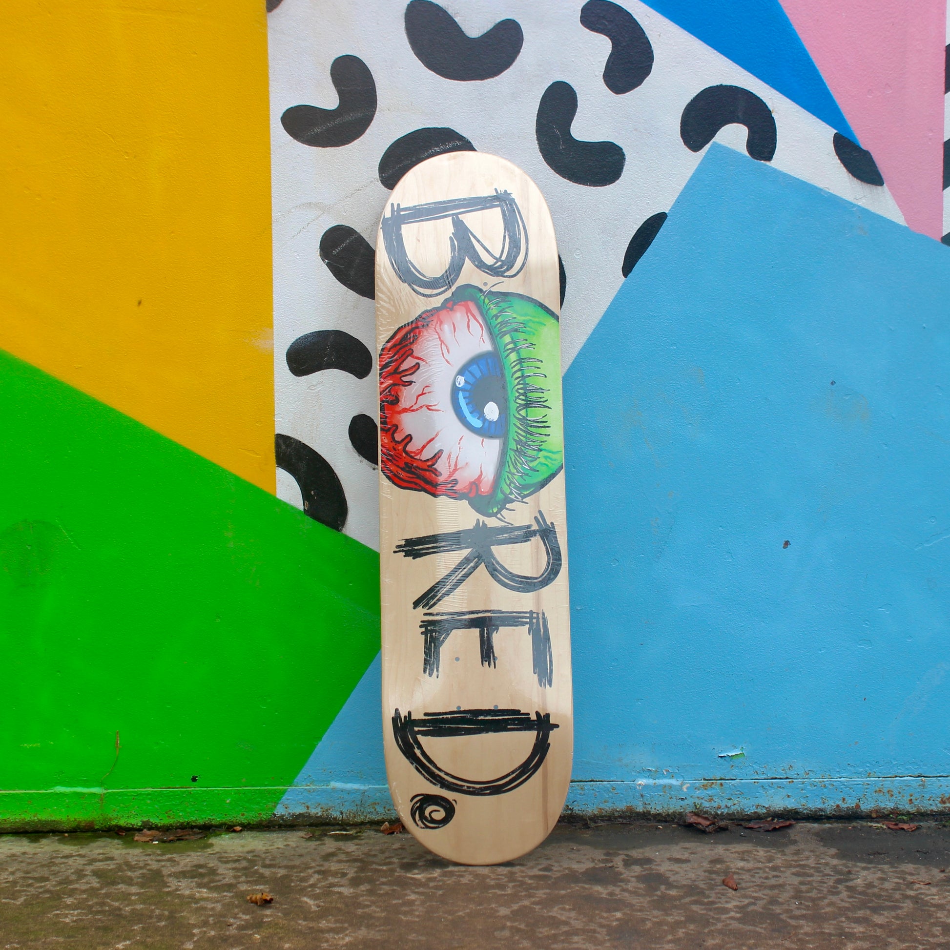 The all-seeing eye is bloodshot, wired and sick of the same old! This design screams BORED in the only way Boredom Skateboards knows how! Loud, chaotic and cray cray!